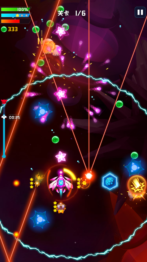在玩家通过单手操控战机躲避弹幕并击败敌人,主线模式采用一章五关的递进设计,每章解锁新场景、怪物和惊喜剧情。无尽模式则考验极限操作,随机宝箱和僚机让每次挑战充满变数。战机武装系统提供多种功能各异的武器,没有绝对强弱之分,只有战术适配——比如追踪弹适合新手,而激光炮擅长清屏。模组系统是最大亮点,例如松手触发狙击或蓄力激光等近百种技能,触发条件各异,组合起来能打出意想不到的连招。击败敌人获得金币后,可升级机体、武装和大招,甚至改变战机形态。画风上,草原、冰川到星空的场景切换,兼顾视觉享受与战斗沉浸感。