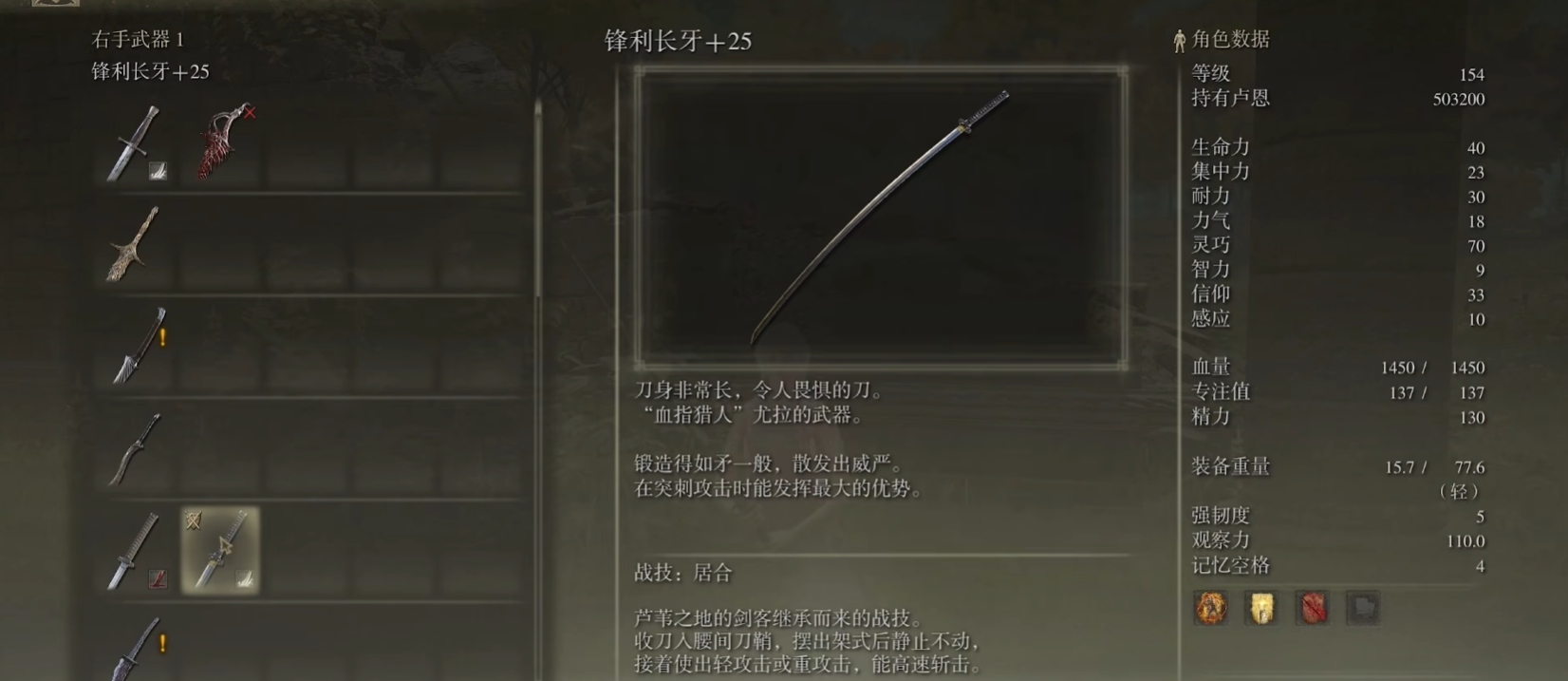 加点方面咱们主推力敏流,灵巧优先点到40,力量补到25左右,这样能充分发挥打刀和长牙的补正效果。初期先把血量堆到20提高容错率,耐力建议15点穿重甲,后期再慢慢补到40。蓝条不用刻意加,但带一两瓶蓝药应对战技消耗就够了。记住双持武器时力量需求会降低,灵活调整属性点能让你更早拿上心仪的武器。