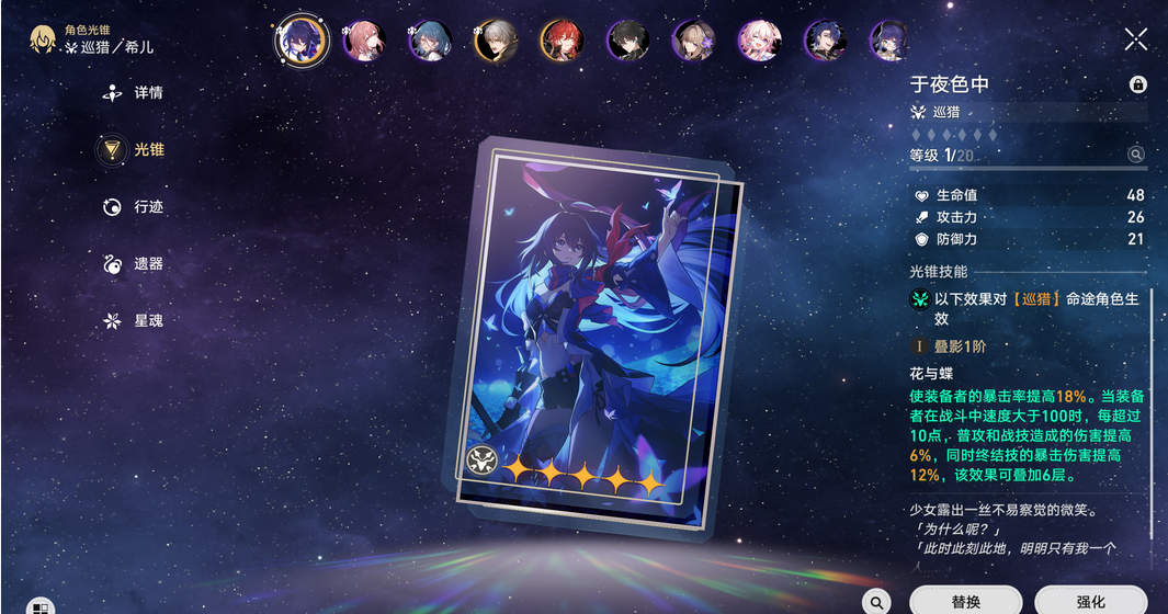首先必须提专武于夜色中,这是最契合她机制的选择。光锥提供的暴击率加成能缓解面板压力,而速度超过100点后的增伤效果完美匹配希儿的高机动性。要注意的是想吃满6层特效需要堆到160速度,这时候1命或队友的加速技能就很重要了。如果速度达标,这个光锥能让普攻、战技和终结技全面受益,属于毕业首选。