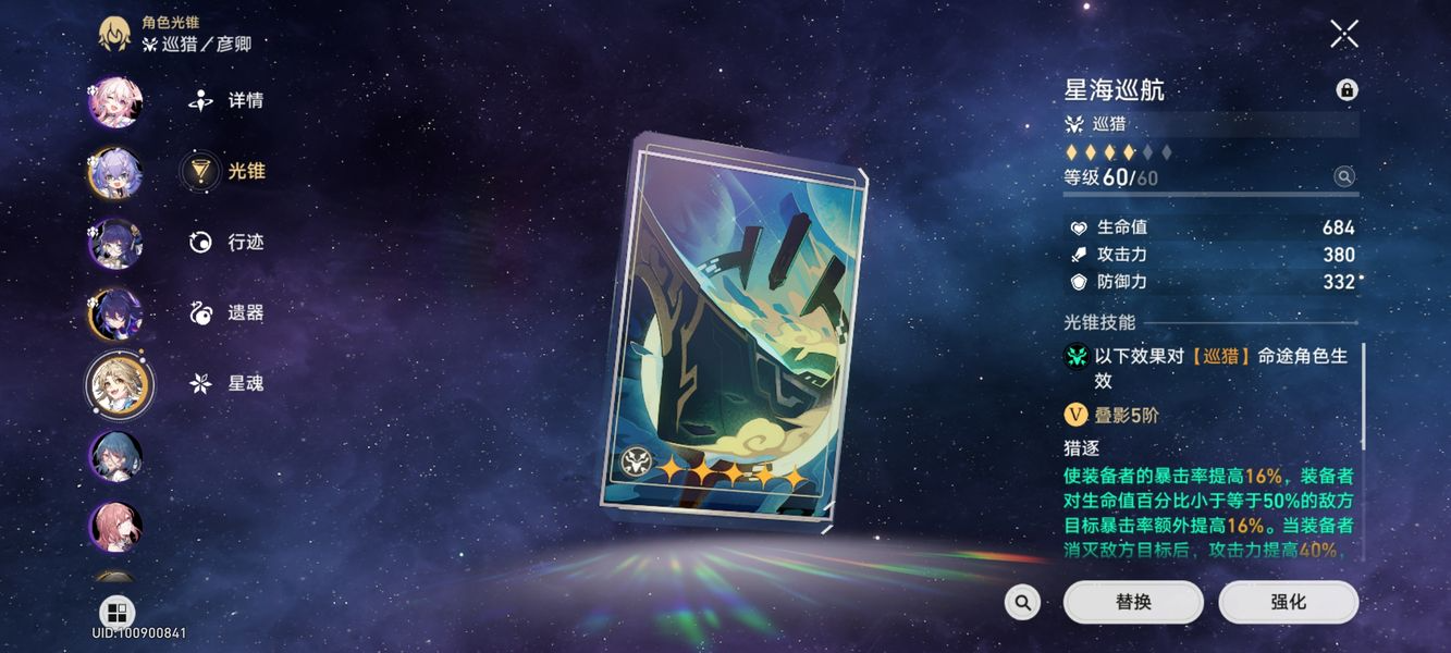 没有专武也黑塔商店兑换的星海巡航是性价比之王。稳定的暴击率提升搭配半血以下额外暴击的效果,特别适合希儿的收割机制。消灭目标后攻击力提升的设定和她天赋的再动完美联动,精炼满阶后强度接近低精专武。重点是这光锥能白嫖到手,对平民玩家非常友好。