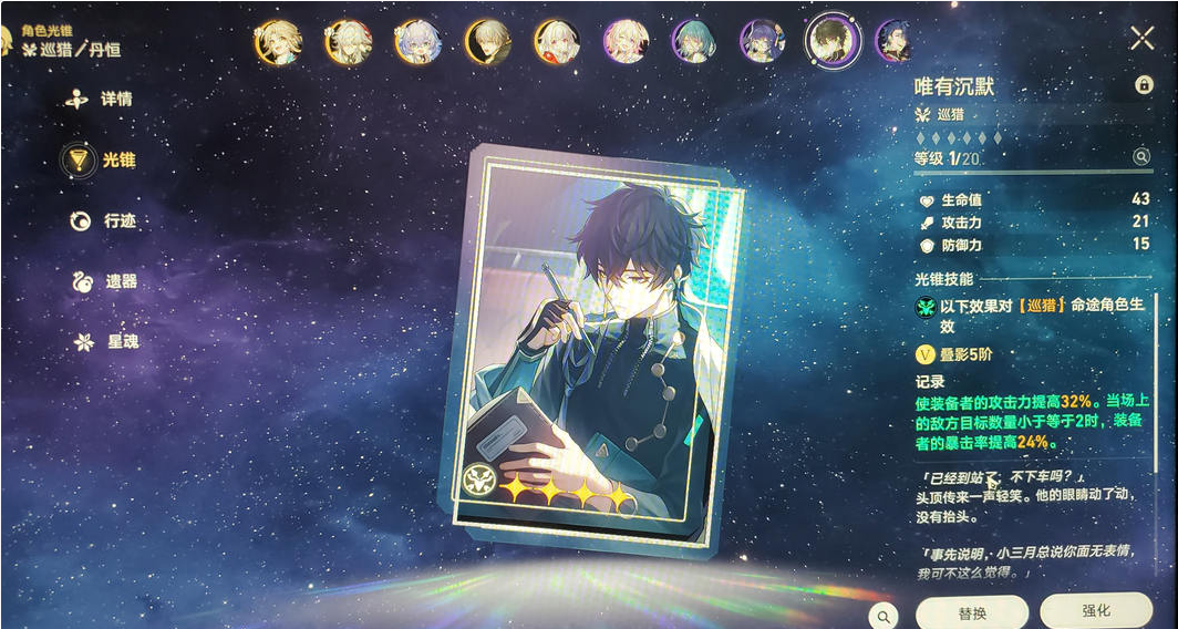 四星光锥里唯有沉默是泛用性较高的选择。攻击力加成简单粗暴,面对单个精英怪时还能激活暴击率提升效果。虽然对群环境会打折扣,但在BOSS战中表现稳定,精炼满阶后提供的数值相当可观。过渡期如果抽到高精论剑也可以考虑,但对输出环境要求比较苛刻,需要全程锁定单一目标。