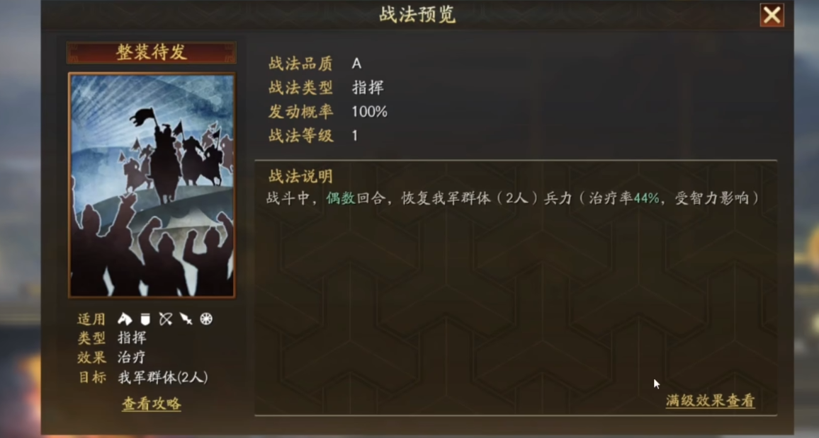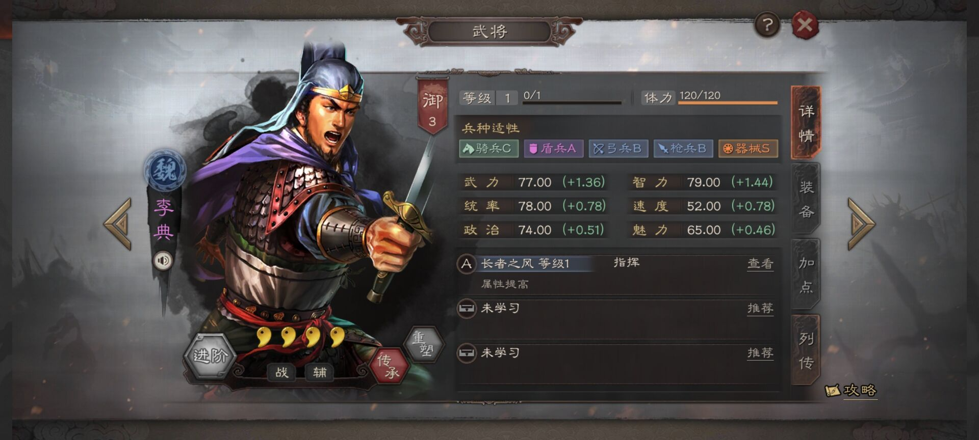 战法选择上,除了自带技能,推荐带整装待发或坐守孤城提供治疗,弥补前期奶妈不足的问题。如果追求控制,可以带出其不意,但要注意概率问题。李典的短板是后期乏力,20级后输出和防御跟橙将差距明显,所以开荒期结束后建议换成更强力的辅助。