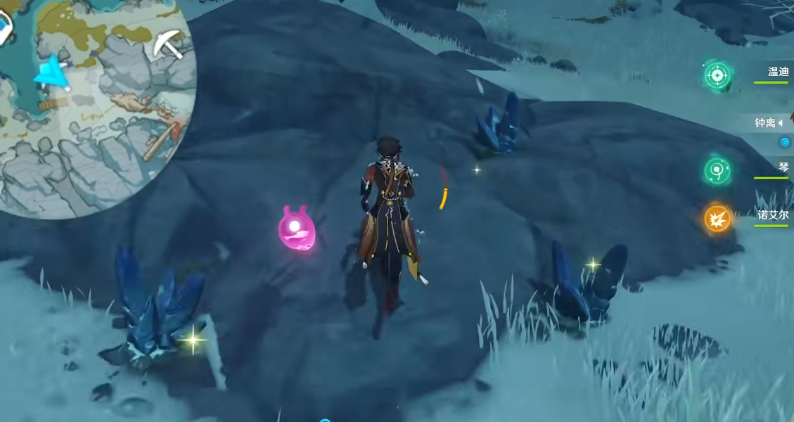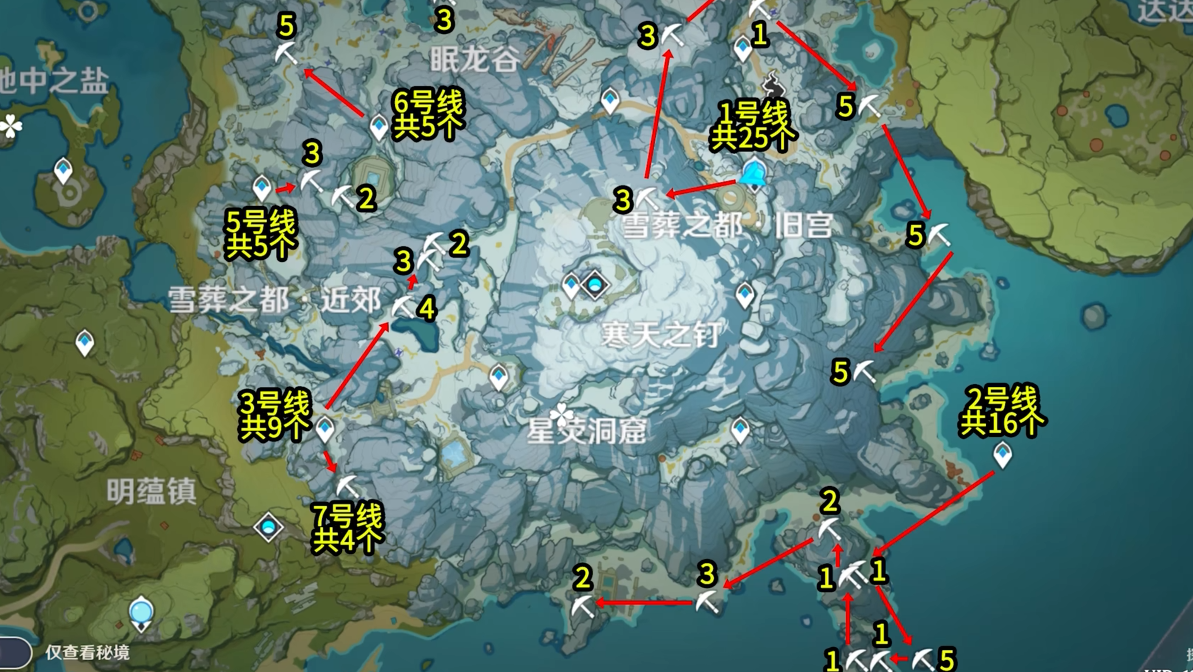 雪山最西侧的山路入口有高产量矿点,传送到眠龙谷对面锚点后往雪葬之都方向走,深赤之石后面能挖到5块以上。右下角海湾区域的矿点虽然路程稍远,但沿着海滩往上走能一次性拿到8块,是单次收获最多的位置。左下角半山腰的矿点比较分散,全收集能拿6块,建议搭配凝光天赋显示矿石位置。
