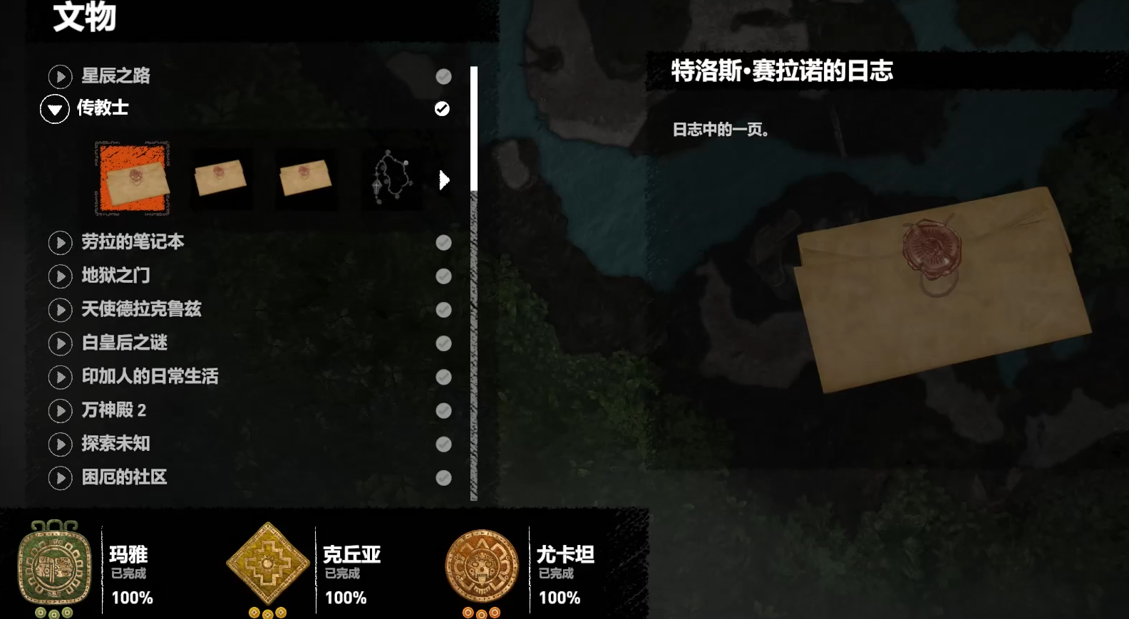 部分遗物的获取涉及复杂的环境互动,例如黄金国文物需在隐秘之城的水潭岔道转角处拾取,而飞行日志则位于秘鲁丛林某架坠毁飞机的残骸附近。独石碑附近的遗物通常需要玩家掌握对应的语言技能才能解读线索,因此提升劳拉的方言能力是高效收集的关键。若遇到无法立即获取的遗物,可先记录位置,待技能解锁后再返回探索。