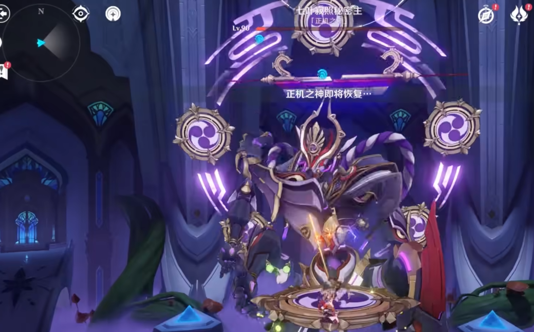 第二阶段开始时,正机之神会获得护盾保护,必须通过新式虚空终端的充能攻击破盾。拾取4个小能量球或2个大能量球可为终端充满能量,长按发射键瞄准攻击可快速削减护盾。破盾后BOSS会召唤4个灭度机,优先击破中央的大型机关,再清理周围三个。全部破坏后拾取能量球释放,可使BOSS进入30秒瘫痪状态,通过四叶印飞上平台输出,角色大招将全部重置。若未在时限内完成机制,BOSS会释放秒杀技能刹那生灭。