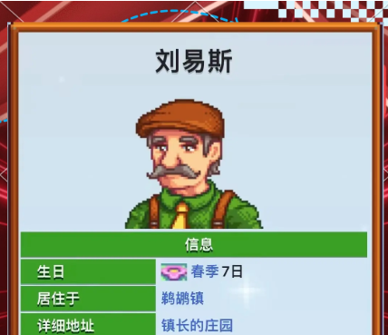 刘易斯的日常行程规律明显,便于玩家追踪。春季上午他常出现在自家庭院,下午则前往诊所或喷泉附近;夏季周三固定拜访玛妮牧场,周五晚间前往沙龙饮酒;冬季活动范围较小,主要在诊所和沙龙。建议优先在春季周二或周五下午拦截,他多在杂货店或喷泉旁。若需快速提升好感,可结合对话与生日送礼,避免因行程变动错过机会。