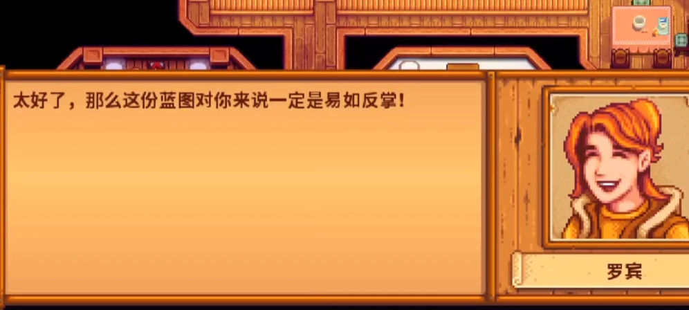 当咱们和罗宾的好感度达到6颗心时,就可以触发她的第一个红心事件了。这时候进入她的房间,会发现她正在清理锯子上的灰尘。她会问咱们是否用木头制作过东西,无论回答是或不是都不会影响剧情发展。接着她会感慨咱们已经成为好朋友,并慷慨地赠送鼓块和长笛块的制作蓝图,让咱们能用自己做的装饰品来布置小屋。这个事件特别温馨,能感受到罗宾对朋友的信任。