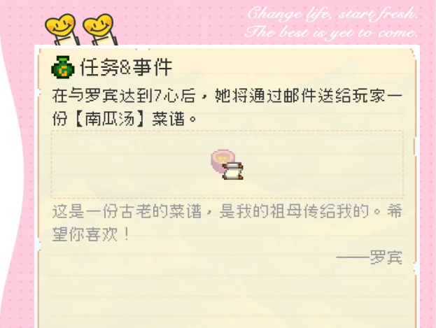 好感度达到7颗心后,罗宾会通过邮件给咱们发送一份南瓜汤的菜谱,这可是她亲手写的哦!从此以后,她还会不定期邮寄一些小礼物,比如木材或者石头,非常贴心。如果想要更快提升好感度,记得经常查看邮箱,别错过她的心意。继续送她喜欢的礼物,好感度会涨得更快。