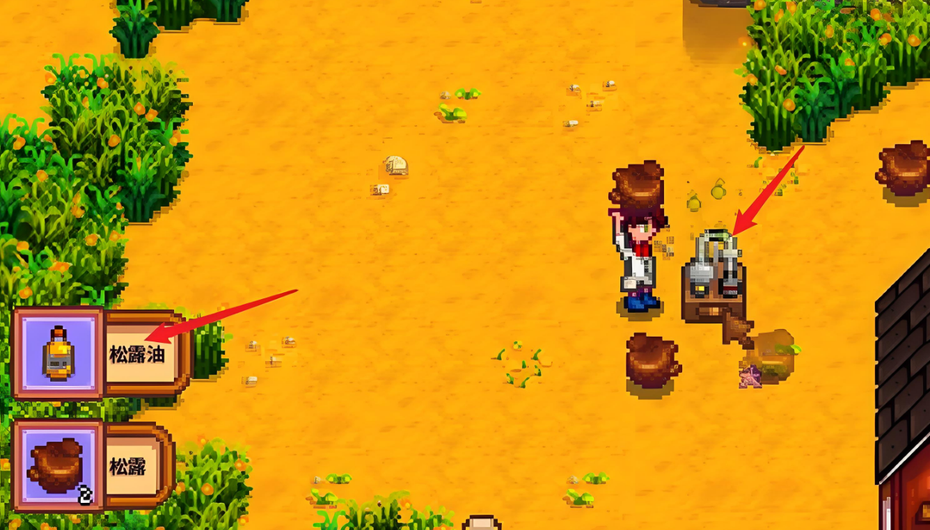 硬木需通过砍伐秘密森林中的大型树桩或木桩获得,每日刷新数量有限,建议定期采集。松露油需将松露放入榨油机加工制成,而松露需通过饲养猪并提升其好感度后,由猪在户外拱地随机产出。松焦油则需将树液采集器安装在松树上,经过一段时间收集获得,需注意区分松树与其他树种。