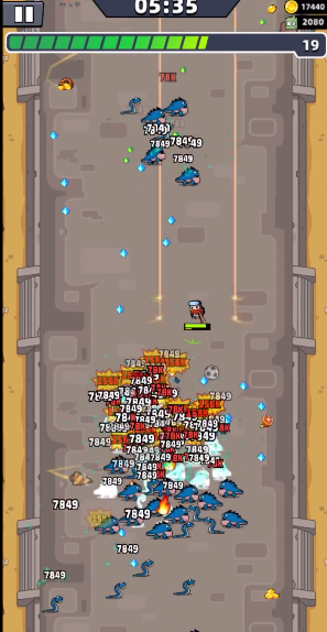 地图是一片废墟地形,有很多障碍物可以卡位。咱们要利用这些掩体遮挡敌人的远程攻击,同时注意别被猪群包围。3分钟时会刷新上方猪群,直接快速冲过去,然后在下半场用Z字形走位拉扯。记住别把下方猪群拖出屏幕边缘,否则会触发更多怪物刷新。4分钟后停止刷怪,但8分钟会有最终决战,必须在此之前让苦无、无人机或足球技能进化成超武。