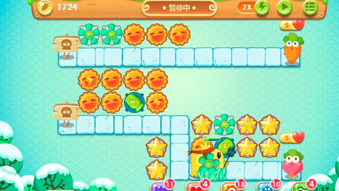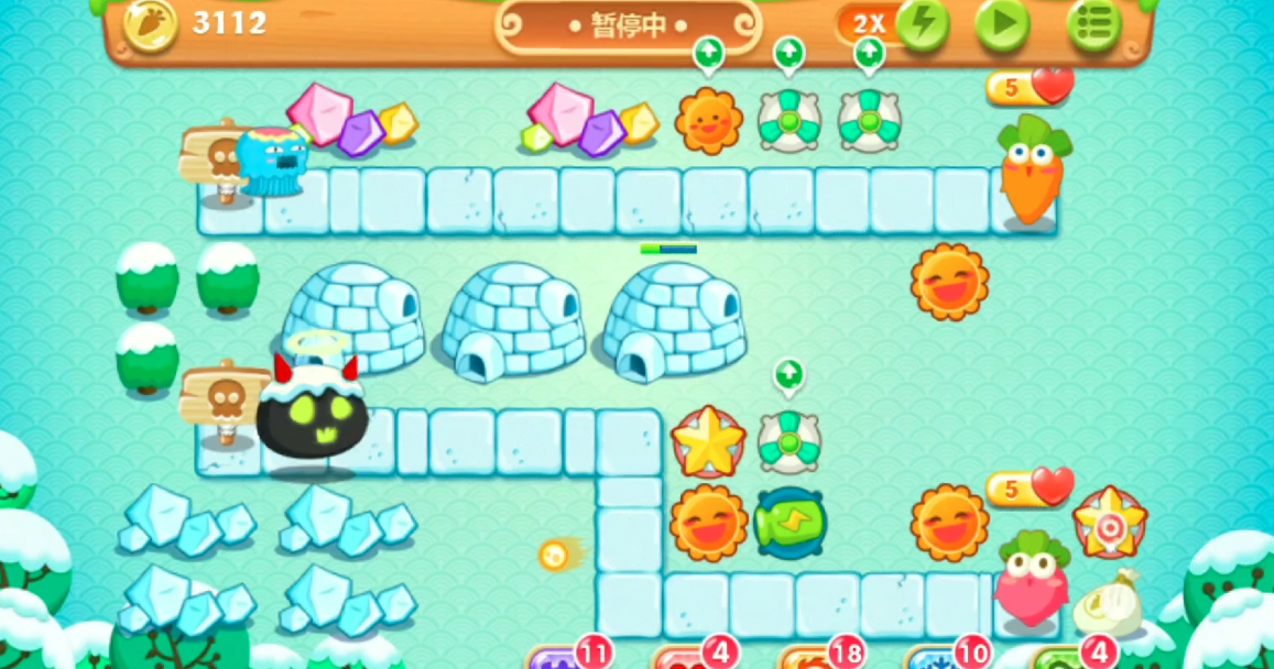 第三关的核心策略在于合理利用炸弹星与便便塔的组合。开局需优先在出口附近建造顶级炸弹星,同时清除右侧雪屋道具以获取隐藏资源。每波怪物进攻前的空闲时间是关键,需集中火力清理障碍物,并在路径中段补充便便塔减速。完成6个炸弹星和2个便便塔的建造任务后,最终清除彩色水晶道具即可获得金萝卜。