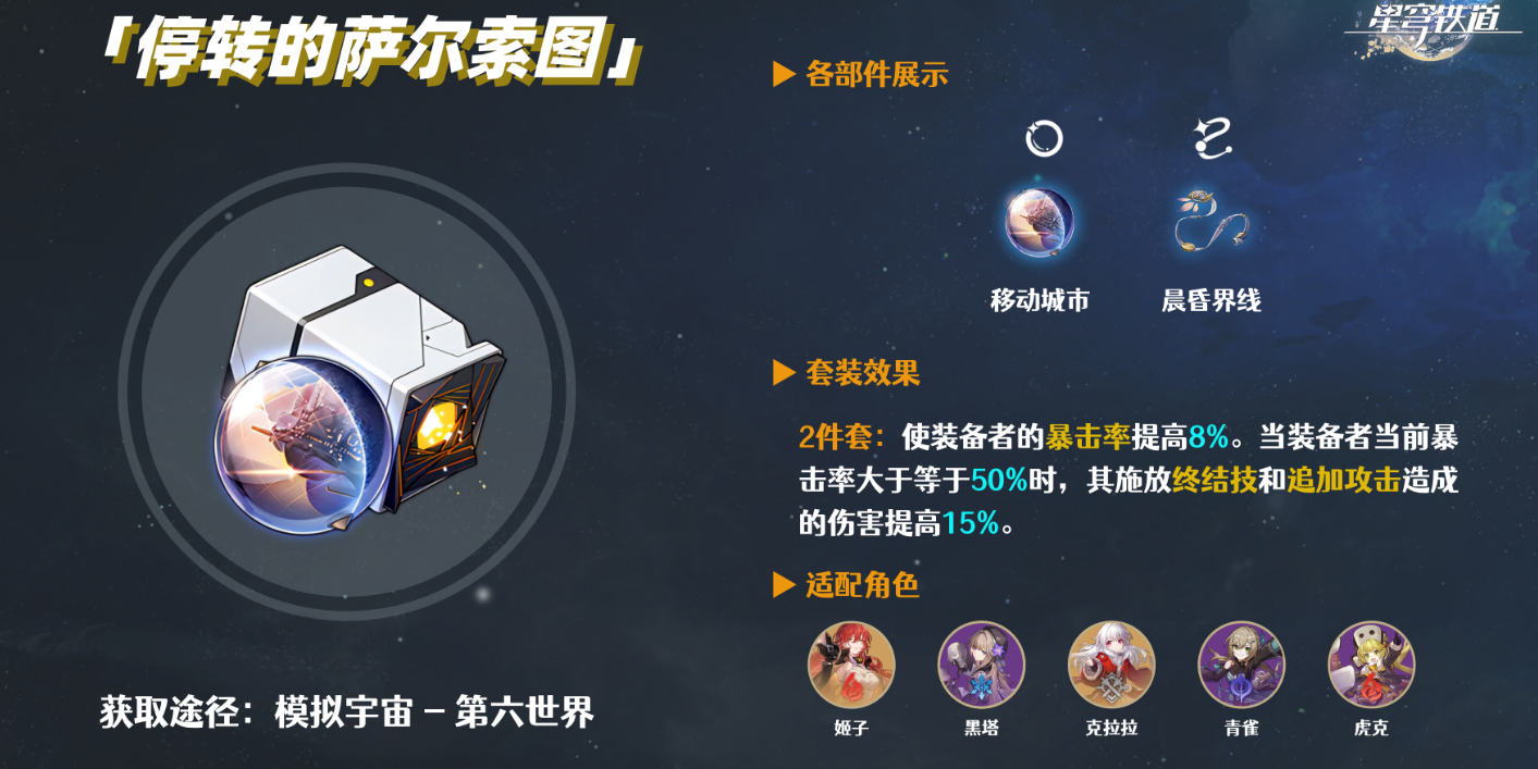 词条选择上,头部和手部固定属性不用纠结,躯干优先暴击率(达标后可换暴伤),脚部选攻击力,位面球必选雷伤加成,连结绳推荐攻击力。副词条双暴(暴击率/暴伤)权重最高,其次攻击力和速度。要注意暴击率必须堆到50%以上才能触发萨尔索图套装效果,如果副词条不够可以先用暴击率躯干过渡。