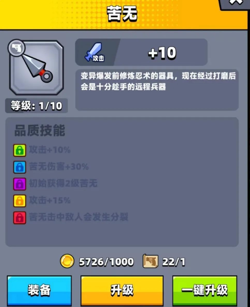 苦无是贫民玩家的首选武器,其自动追踪特性大幅降低操作难度,且无需氪金即可获取。该武器升级为幽灵手里剑后能实现无限发射,对单体BOSS和群体小怪均有稳定输出表现。相比之下,霰弹枪虽后期伤害可观,但前期生存压力较大;左轮与太刀因需手动瞄准且攻速较慢,不适合新手过渡。武器合成方面,优先将苦无升至红色品质,通过紫2+紫2合成金1,再以金3+金1+金1合成红1,逐步提升基础属性与技能效果。