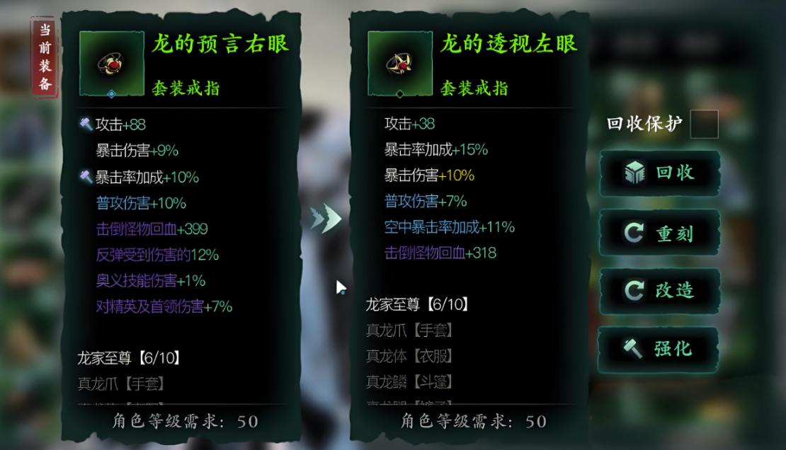 真龙套装的戒指分为龙的透视左眼和龙的预言右眼两枚,属于十件套的重要组成部分。凑齐四件套可解锁双心法槽位,六件套能提升心法绝技等级,十件套则允许装备两个副心法。虽然完整套装效果强大,但单独佩戴戒指也能显著提升心法效果,建议优先获取戒指部件以快速提升战力。副本中的特定精英怪会额外掉落锻造材料,这些材料可用于后续套装强化。