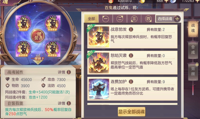 他的技能十二奇策是多段伤害,配合战魂弱点突袭的增伤效果,能快速压低敌方血线。算无遗策和兼弱攻昧还能额外叠加减益,进一步放大弱点突袭的收益。如果选择破釜沉舟,记得把他放在前排,利用低血量时的爆发和免伤反打。战魂属性优先选暴击、吸血和基础怒气,这样能保证他更快释放怒攻并维持血量健康。