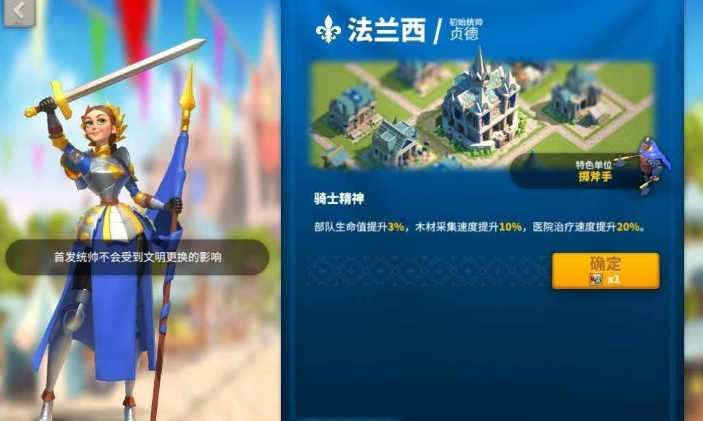 贞德作为法兰西文明的初始紫色统帅,定位为辅助型武将,兼具采集增益与团队作战强化能力。其核心技能上帝的启示能为周围友军提供步兵生命值、骑兵防御力、弓兵攻击力各30%的加成,并每秒恢复50点怒气,持续4秒(觉醒后)。该技能在团战中能显著提升队伍整体战力,尤其适合混兵阵容。贞德的二技能奥尔良的少女提升25%采集速度与负载,使其成为前期资源采集的高效选择。
