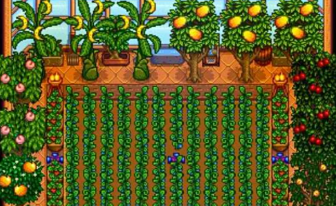 温室和姜岛是种树的黄金地段,这里不受季节限制,一年四季都能生长。温室角落种上古水果或果树,搭配洒水器就能实现自动化管理。姜岛火山区的空地适合种热带水果比如菠萝,搭配树肥能让生长速度大幅提升。如果觉得普通树木占地太多,可以用地板围出种植区,既能防止种子乱掉,又能保持农场整洁。