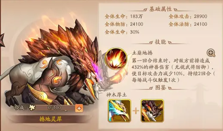 撼地灵犀作为控制型神兽,技能土崩地撼能在首回合结束时对敌方前排造成无视防御的群体伤害,并有概率施加眩晕效果。其强制控制特性可有效打断敌方输出节奏,尤其针对依赖先手技能的阵容。但相比玄武的全能性,灵犀缺乏团队增益效果,需搭配高爆发武将快速建立优势。该神兽在PVP中表现突出,但PVE场景中控制收益可能受限。