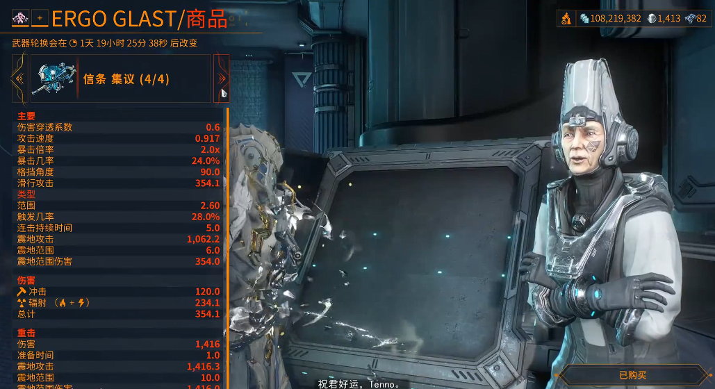 信条集议这把酷炫的剑盾武器是在中继站的佩兰数列商人Ergo Glast那里兑换的。需要用40个堕落全息密钥才能换到,而且这把武器自带的元素加成是随机的,每4天会轮换一次。所以如果小伙伴们看中了某个特定属性的信条集议,记得留意刷新时间哦。