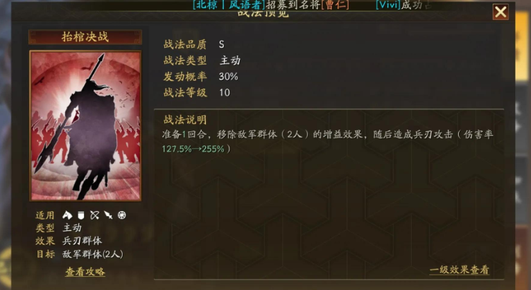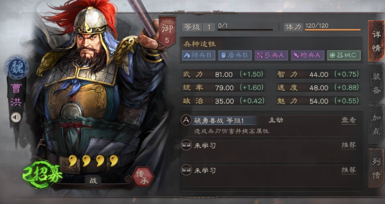 庞德的自带战法抬棺决战能移除敌军全体的增益效果并造成兵刃伤害,这使他在对抗依赖增益的阵容时具有显著战略价值。庞德的武力成长达到较高水平,但智力与统率相对平庸,因此需通过阵容和战法弥补短板,其战法发动率已调整至更稳定的水平,增强了实战可靠性。曹洪的自带战法骁勇善战可对敌军单体造成高额兵刃伤害,并显著提升自身速度属性,从而在战斗中争取先手机会。曹洪作为均衡型武将,既能输出又能提供辅助,其速度增益可影响整体战斗节奏。