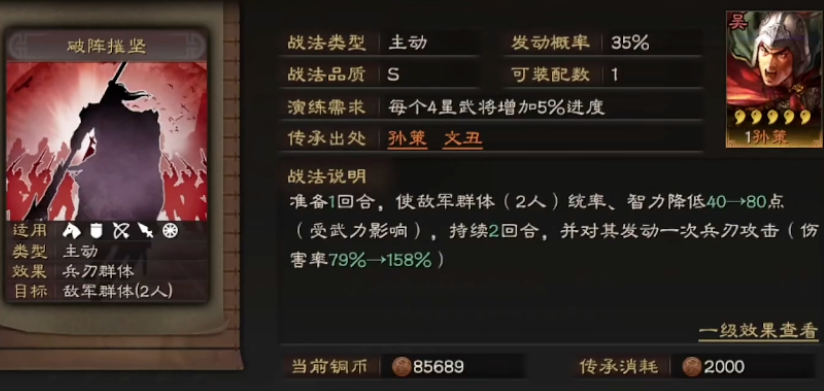 如果你实在觉得文丑上场打架太费心思,或者已经有了更成熟的主力队伍,他还有没有其他价值呢,答案是肯定的,而且价值不小。文丑一个非常重要的用途是用来兑换强力的事件战法。在S4赛季,你可以用文丑和徐晃这两个武将,兑换一个叫做引弦力战的弓兵专属事件战法。这个战法能提升自身武力,并有概率触发群攻效果,非常适合太史慈、孙权这类依赖普通攻击输出的弓兵武将,是组建强力弓队的关键战法之一。另一个更常见、也更经典的用途是传承。传承文丑,可以获得一个非常实用的S级主动战法破阵摧坚。这个战法需要准备一回合,能够对敌军两人造成兵刃伤害,并且同时降低他们的统率和智力属性,持续两回合。这个破防效果极其强大,能显著提升队伍后续所有兵刃伤害的打击效果,是许多一线物理爆发队(比如蜀枪、桃园队)的标配战法之一。对于很多玩家来说,将一个文丑传承出破阵摧坚给主力队伍使用,其带来的战力提升,远比勉强让文丑上阵要划算得多。