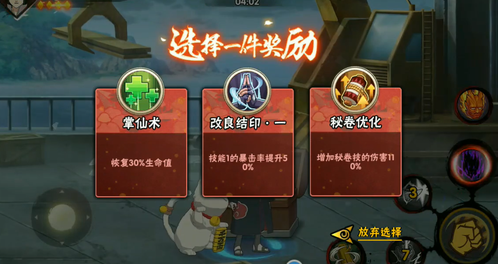 进化过程对玩家的操作和策略有一定要求,建议在幻之试炼2中优先选择小佐助作为起始忍者,并专注于获取与秘籍相关的强化选项。例如玩家可以优先升级技能伤害或选择增加生存能力的密卷,这样能更稳定地推进到后期关卡,从而重复挑战以收集足够数量的秘籍。玩家应避免在进化前过早死亡,否则收集进度可能重置。