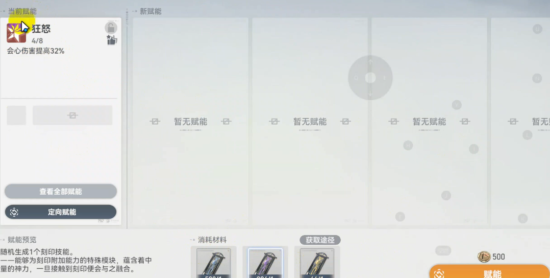 赋能系统是为角色刻印附加额外属性的核心养成环节,其通过消耗在副本中获得的赋能模块,为刻印随机附加不同颜色与效果的词条。这些词条主要分为三类:红色词条通常用于提升攻击伤害,例如强攻、狂暴、狂怒;蓝色词条多涉及能量、怒气管理与生存,如意志;黄色词条则偏向防御属性。为角色进行赋能规划前,需首先明确其培养方向是侧重输出还是辅助,这将从根本上影响赋能词条的优先级选择。