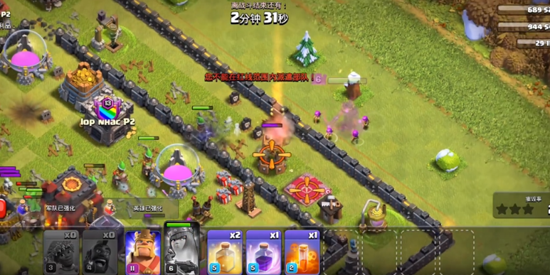 女王的搭配需根据其等级与对战阶段灵活调整,高等级女王在搭配天使后具有强大的核心推进能力,适合在高杯段作为前戏主力。等级一般的女王则更依赖与其他地面部队如胖子、炸弹人的配合,为中低杯段抢夺资源提供稳定输出。若女王等级较低,可考虑将其作为辅助,搭配气球苍蝇等空军流派进行侧翼支援或清边。女王的新史诗技能寒冰箭矢拥有持续的被动减速效果,无需主动触发便能影响战局,这使其能与根曼武神等多种流派进行搭配,提升整体进攻的控场与三星率。
