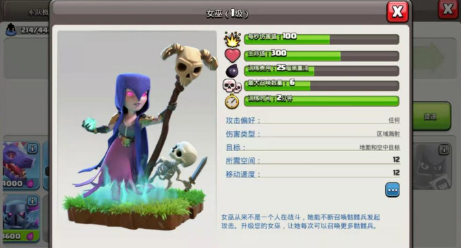 女巫是一个独特的兵种,她能够持续召唤小骷髅协助作战,攻击速度为0.7秒,攻击类型为0.3格区域溅射,每6秒召唤一次骷髅兵。在9本大本营时,一级女巫可以召唤3个骷髅,上限6个,每秒伤害25点,生命值75点,训练需要250黑水。升级到二级后,召唤数量增加到4个,上限8个,伤害提升到30点,生命值100点,需要350黑水和7级实验室。女巫死亡后还会额外产生小骷髅,增强她的持续威胁能力。