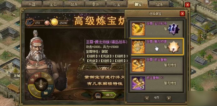 解锁御宝系统需推进主线任务,通关指定副本后开启炼宝炉,打造紫色御宝需通关更高阶副本解锁图纸,同时准备金币、镔铁、抛光剂、木炭等核心材料,低品质御宝可通过分解获取精粹,用于提升御宝突破成功率,减少淬火材料消耗。紫色御宝是唯一可淬火的御宝品质,淬火界面消耗木炭随机刷新属性,基础属性优先保留攻击、兵力加成,特殊属性中定军为破甲核心词条,出现后需立即锁定,避免刷新覆盖,淬火过程不追求单次出极品,可积累大量木炭分批洗练,提升定军属性出现概率。