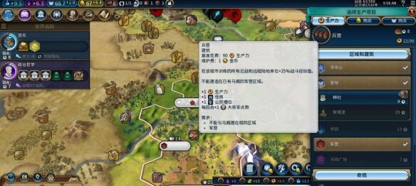 城市基础住房由水源决定,临河临淡水湖的城市基础住房更高,沿海次之,无水地块最低,前期选址直接决定人口上限潜力。制陶术解锁后优先建造粮仓,可直接增加2点住房,是缓解早期住房紧张的核心手段;进入文艺复兴时代后建造下水道,同样提供2点住房加成,与粮仓形成前后衔接。无水或缺水城市需尽快修建水渠,补足淡水带来的住房增益,沿海城市则可依次建造灯塔与海港,各获得1点住房,弥补水源劣势。学院区的大学、军营区的兵营与马厩、军事学院均可提供1点住房,同一区域建筑不重复叠加,需根据城市发展方向选择性建造。