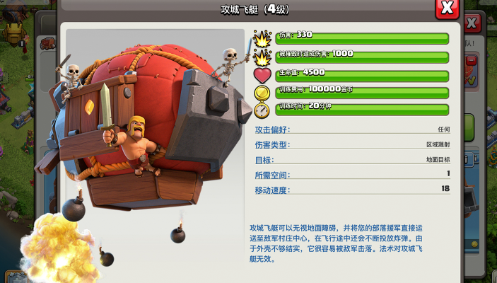 实战中攻城飞艇的使用有明确的战术逻辑,释放前需观察敌方防空火箭、隐形炸弹、空气炮等对空防御布局,避开密集火力区域选择投放角度,提升飞艇抵达核心区域的成功率。搭配冰冻、地震等法术使用时,可快速清除敌方关键防御建筑,让内部援军稳定落地输出,常见用法为运载超级法师、大雪怪等强力单位直击敌方大本营,实现快速爆本打乱防御节奏。不同等级的攻城飞艇在生命值、炸弹伤害上存在差异,升级攻城机器工坊可逐步提升飞艇属性,让其在实战中承受更多伤害,完成更远距离的部队投送任务。