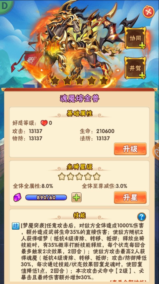 不同玩法场景下兽魂与神兽搭配有明确策略,PVP竞技场、王者竞技优先选择穷奇、应龙等金色神兽,穷奇开局触发全员伤害与灼烧,高星级可减怒敌方,应龙能提供前排回血、回怒与疾风buff,适配快节奏对抗;PVE推图与无双试炼可搭配灵犀、青鸾,灵犀前排减攻并附带眩晕,青鸾血量达标时触发全员回血,高星级还能给友军无敌状态,保障阵容续航;日常副本则用机关鸟、猞猁等橙色神兽过渡,兼顾效率与资源消耗,避免核心资源浪费。