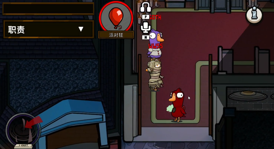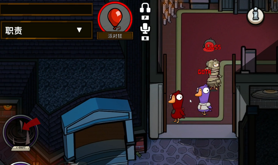 派对狂是鸭子阵营中的一个特殊角色,它的技能可以让会议期间某个玩家的声音变得高尖,从而扰乱发言节奏。这个角色虽然属于坏人阵营,但主要作用偏向娱乐性质,技能效果不会直接影响游戏胜负,更多是用来制造欢乐氛围。派对狂的变声技能使用按键是左侧Shift键,刀人键则是空格键,查看场景破坏是左侧Ctrl键。