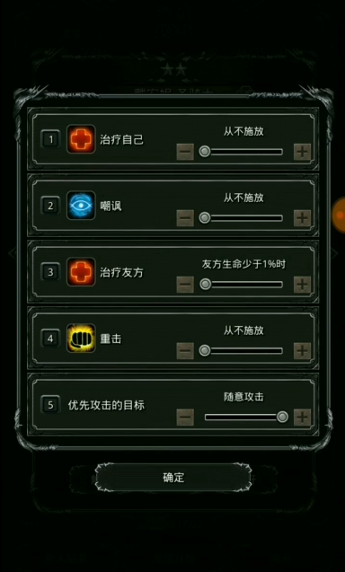 三个治疗职业的技能需调整为仅开启1%治疗队友,其余技能全部关闭,确保治疗频率足够覆盖赫芬琳的攻击间隔。输出位(刺客或巫医)则仅开启掉血技能,如刺客的1、3技能或巫医的1技能,其他技能关闭以避免干扰输出循环。战斗中需注意治疗职业的奶量不能过高,否则可能导致输出位无法及时进入重伤状态,从而破坏机制稳定性。抗性方面,输出位的抗性需低于10点,否则赫芬琳的流血效果可能无法正常施加。