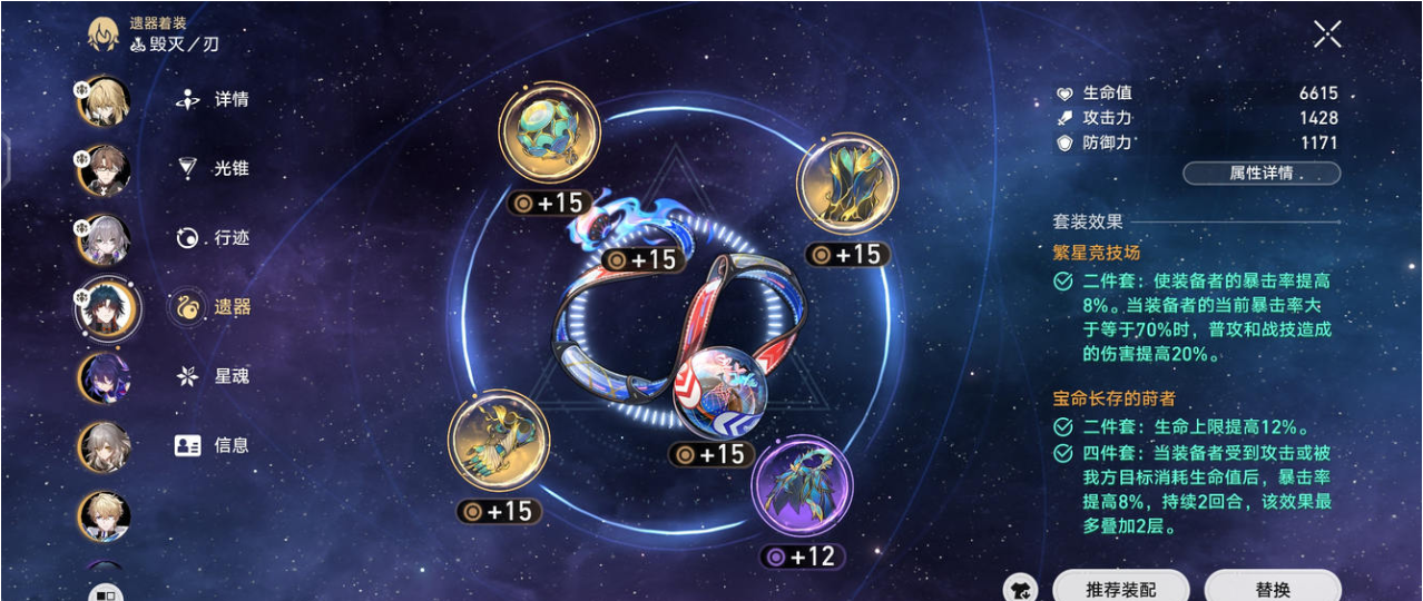 如果暂时刷不出完美量子套,可以用野穗伴行的快枪手2+2过渡,但别投入太多资源。内圈遗器的停转的萨尔索图也是可选项,不过它对大招增伤的效果不如繁星套全面。记住遗器强度七分看词条,三分看套装,先保证关键属性达标再追求完美搭配。