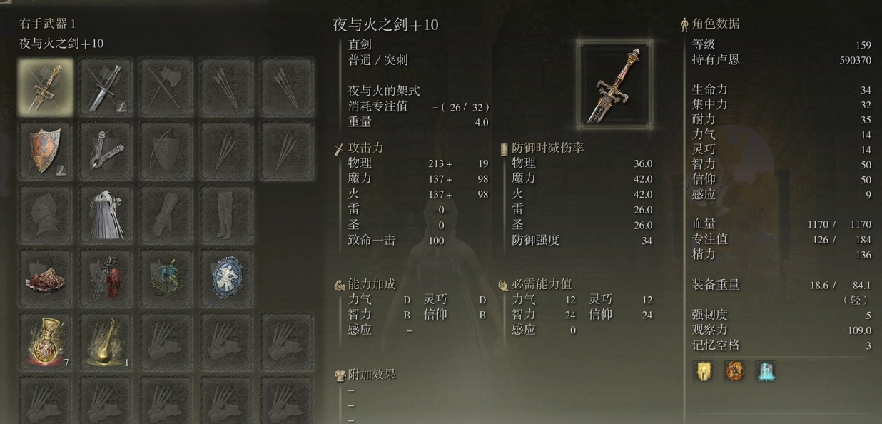 艾尔登法环智信流是一种结合智力与信仰属性的综合流派,其核心优势在于同时兼容魔法与祷告的输出能力,并具备极高的战术灵活性。该流派成型后可通过夜与火之剑的战技实现爆发性伤害(单次战技可达一两千点),配合腐败吐息、黑火球等远程手段形成多层次的攻击体系。智信流对装备依赖度较高,关键武器包括夜与火之剑、黄金律法圣印记,护符推荐魔力对蝎、红羽七刃及古王护符,防具可选择雪魔女尖帽或女王弯月冠以强化特定属性加成。加点方面建议优先满足24智力与24信仰的基础阈值,随后逐步提升生命值与集中力以保证生存与续航。