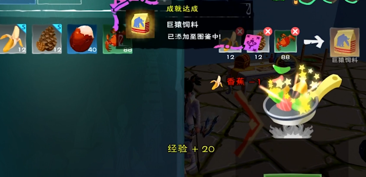 饲料配方是大闸蟹、香蕉和松果,把这些材料放进烹饪锅就能制作出来。松果需要砍松树获得,香蕉得砍香蕉树,大闸蟹则要去湖边钓鱼,钓不钓得到全看运气。建议多准备些饲料,因为巨猿胃口不小,保底需要16包才能驯服成功。