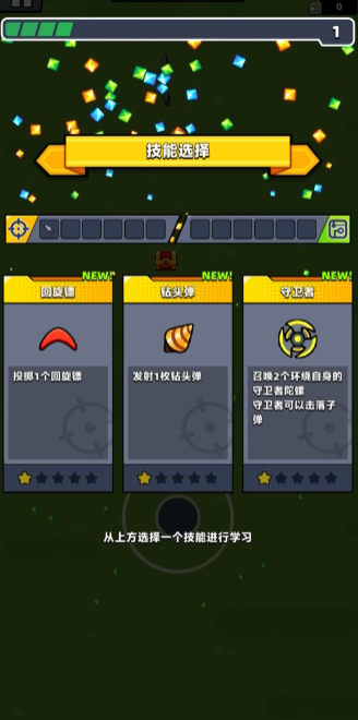推荐使用苦无作为主武器,因为它自带自动追踪功能,特别适合新手操作,不用费心瞄准就能稳定输出。前期优先升级守卫者和立场发射器,这两个技能能有效阻挡小怪近身,给咱们创造安全的输出环境。雷电发射器和钻头也是不错的选择,记得尽早把它们合成超武哦。