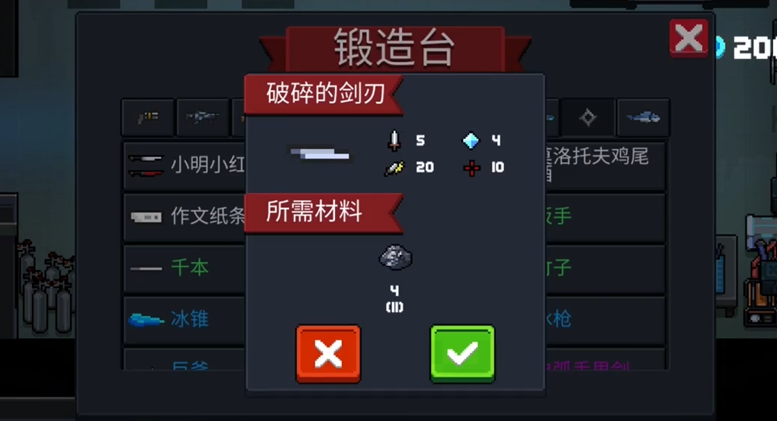 破碎的剑刃是合成重铸的圣剑的另一半必需组件,同样需要在锻造台制作。制作破碎的剑刃需要消耗四个铁矿石。与剑柄不同,剑刃属于投掷武器类别。当玩家同时拥有破碎的剑柄和破碎的剑刃后,即可进行下一步的合成操作。这两件基础武器本身性能较为普通,剑柄攻击范围小且攻速较慢,剑刃作为白色品质武器属性也相对平庸,它们的主要价值在于后续的高级合成。
