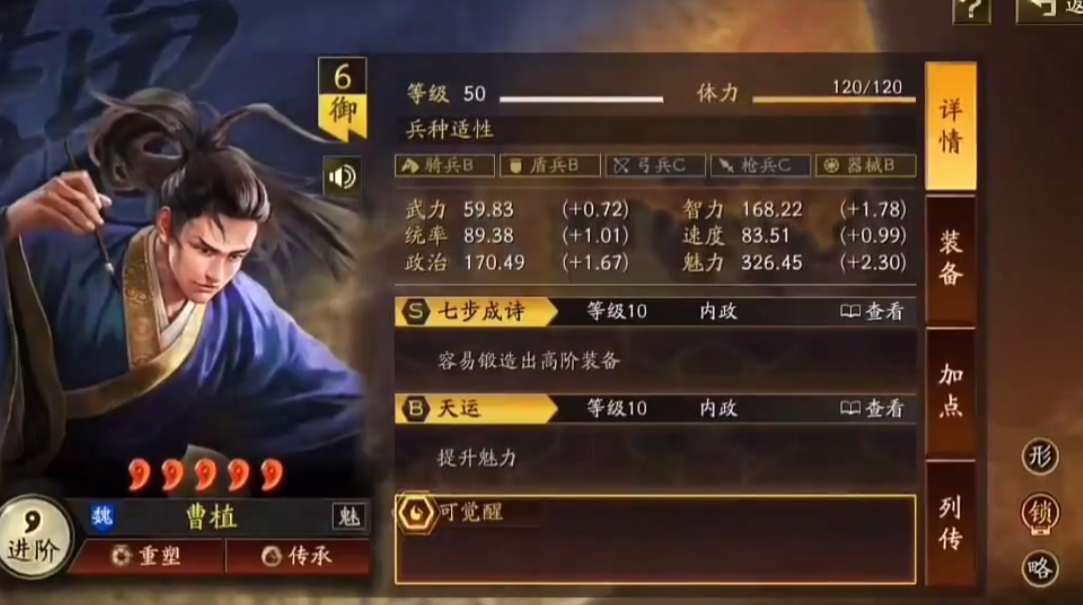 曹植在三国志战略版中作为寻访武将的表现属于中等水平,其核心价值在于较高的魅力属性成长。魅力值是影响寻访高阶奖励概率的关键因素,根据实测数据,游戏内每1点魅力约提升0.06%的高阶奖励出产率。曹植的基础魅力属性与成长系数使其能够胜任寻访工作,但与顶级寻访武将相比存在明显差距。