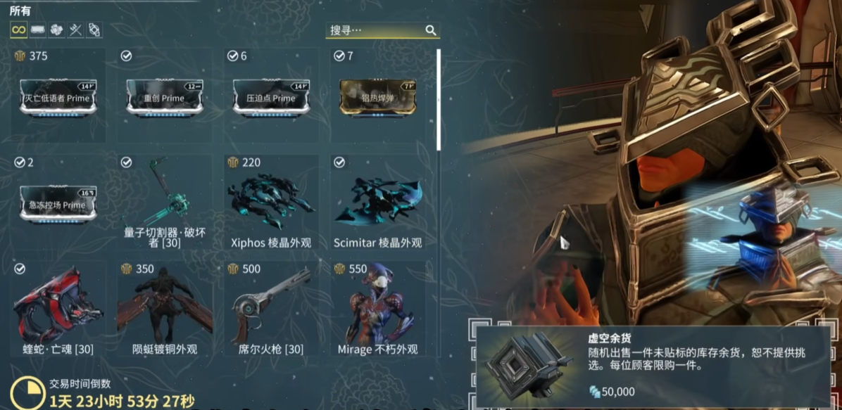 虚空商人提供的商品种类丰富,主要包括传说品质的振幅晶体(Prime Mod)、稀有武器变体、战甲外观和装饰品。Prime Mod是普通Mod的强化版本,属性更优但升级成本更高,例如持久力P、川流不息P等。武器方面,他可能携带棱晶、破坏者或亡魂系列武器,这些武器通常比原版拥有更高的基础属性或独特特效。他还会出售战甲配件、披风、飞船装饰等外观物品,部分商品具有限时独占性。