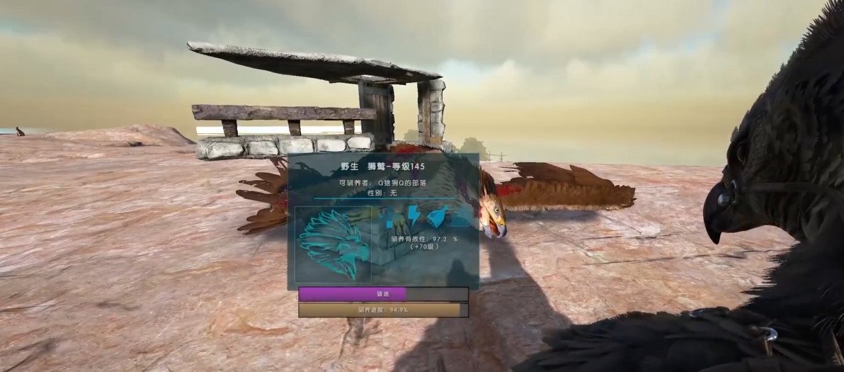 异特龙蛋饲料效果最好,没有的话用优质生肉或羊肉也行。驯服过程很慢,记得随时补充麻醉药,别让它中途醒来。如果驯服进度条涨得太慢,可能是食物不够或者麻醉值掉了,及时调整。成功驯服后,狮鹫就是你的了,不用鞍具也能直接骑乘,非常方便。