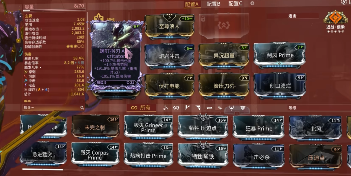 星际战甲中的终极螺钉弧月刀是一把集团近战武器,它的外观设计非常霸气,刀刃部分改成了金属突刺,整体看起来比普通弧月刀更宽大。这把武器的特点是触发几率不错,暴击率也刚好够用,适合走双修路线。虽然基础伤害以穿刺为主,但拐刀姿态自带强制切割效果,所以实际用起来伤害表现还算可以。不过这把武器的攻击范围比较小,算是同类武器的通病。