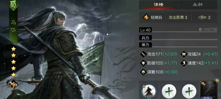 传统蜀骑阵容通常采用徐庶、关羽与马岱的组合。徐庶携带疾战和文伐,利用双追击战法高频触发马岱被动;关羽配备全军突击和谋定后动,提供解控与增伤;马岱则选择击势和磐阵善守,前者强化爆发后者保障生存。该阵容优势在于前三回合即可完成伤害积累,但对战法红度要求较高,白板马岱需优先提升攻击属性弥补输出缺口。