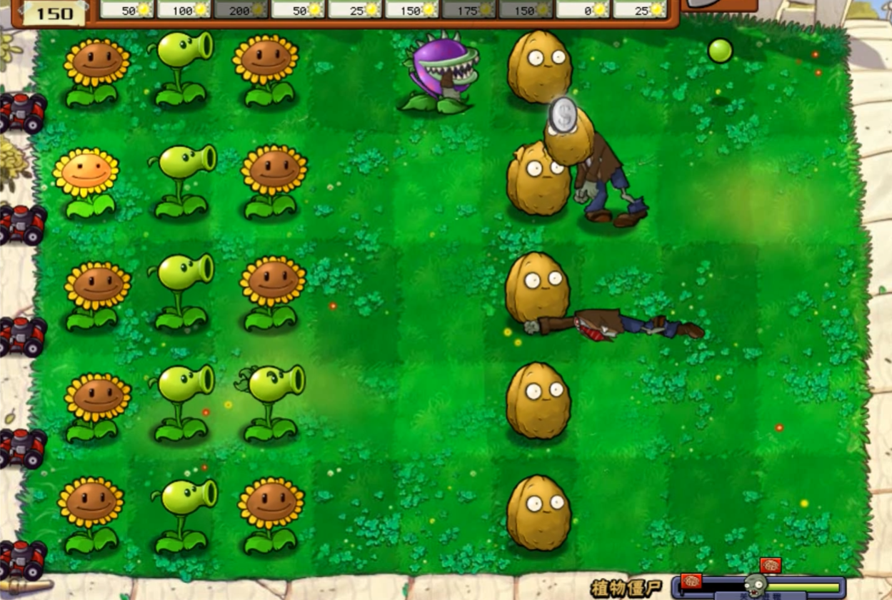 阳光攒够后,优先在中间那行补三线射手,上下两路的大蒜要是被啃坏了就立刻补上。坚果放在最前排能扛住僵尸的进攻,地雷可以对付漏网的家伙。樱桃炸弹别省着,看到僵尸聚在一起就果断用,尤其是铁桶僵尸和坚果僵尸出现时,一个炸弹能解决大麻烦。中间那行的输出是关键,上下两路只要拖住僵尸就行。