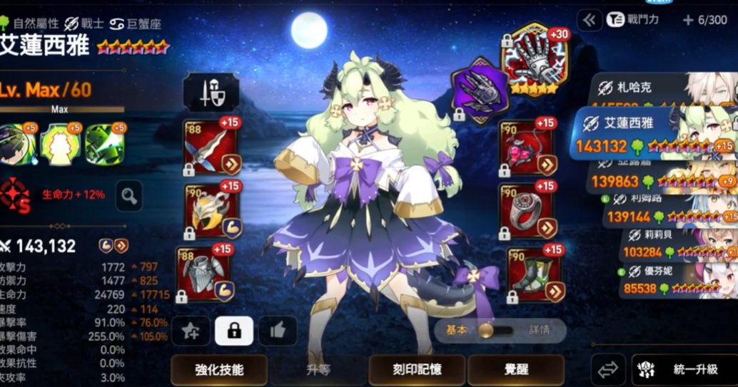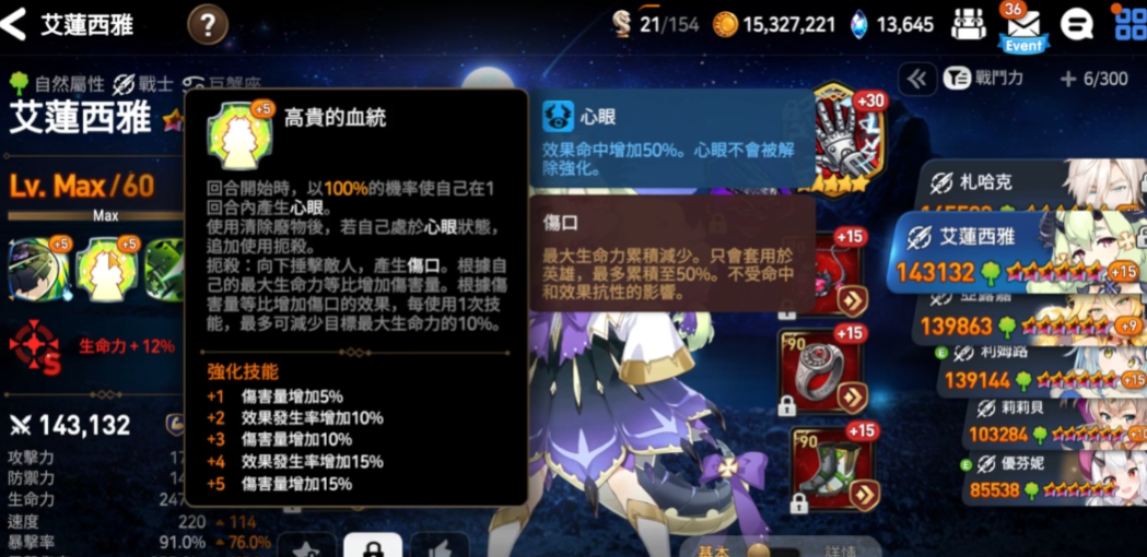 艾莲西雅是自然属性的五星战士,外号姨妈龙,她的核心优势在于生命值倍率伤害和功能性技能。一技能清除废物能概率降低敌人防御,二技能高贵的血统提供心眼效果并触发额外攻击扼杀,三技能开天辟地可清除敌方全体强化效果并为我方提供防御增益。她的输出依赖生命值加成,装备选择上优先堆叠速度和生存属性,伤口套能最大化压制敌方肉坦的血量。