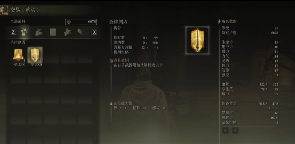 圣律剑刃是游戏中一个非常实用的祷告技能,能在右手武器上附加圣属性伤害,持续90秒,还能防止不死生物复活。想要释放这个技能,首先需要确保你的角色满足13智力和13信仰的属性要求,同时装备指头圣印记作为触媒。记得右手武器不能是属性质变或特殊武器,否则无法附魔。