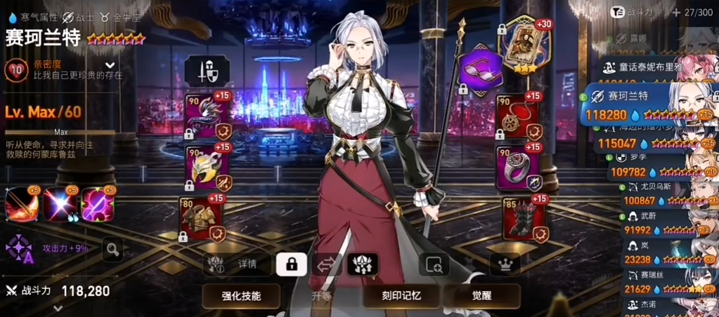 装备搭配上,优先保证暴击率达标,至少堆到70%以上才能稳定触发暴击。暴击伤害和攻击力属性尽量拉高,神器推荐白日梦小丑,能根据目标血量提升伤害,完美契合她的收割机制。速度不用刻意堆,保持在120-130左右即可,毕竟咱们主要靠技能打爆发,不是走连发路线。