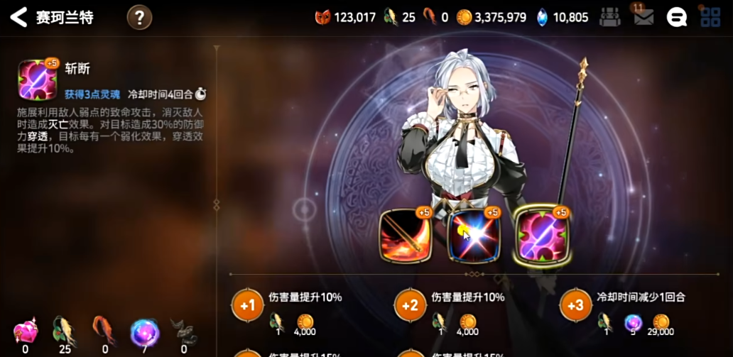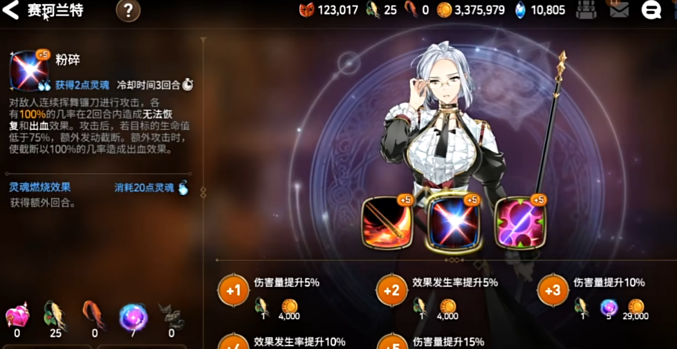 旧水镰(赛珂兰特)的核心加点思路围绕她的技能机制展开,优先提升二技能粉碎和三技能斩断的等级。二技能是主要输出手段,附带流血效果,点满后伤害和debuff触发率大幅提升。三技能作为爆发技能,点满能提高斩杀线,尤其在PVE中表现突出。一技能截断虽然实用,但资源紧张时可以暂缓加点,后期再补满。